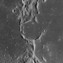 Winthrop is the remnant of a lunar impact crater that has been flooded by lava from the Oceanus Procellarum. It was named after American astronomer John Winthrop.[1] It lies across the western rim of the much larger crater Letronne, a feature that has been nearly destroyed by the intruding mare lavas. All that survives of Winthrop are a few segments of the outer rim.