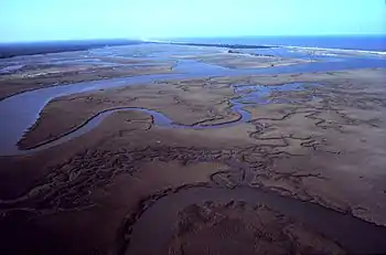 Winyah Bay is the fourth-largest estuary on the US East Coast, when classified by discharge rate.[2] It is home to many aquatic and terrestrial species, including sturgeon, sharks, dolphins, red drum, stingrays, star drum, white shrimp, blue crabs, pelicans, bald eagles, cormorants, and various species of seagulls.