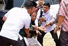 The attacker, identified as Syahrial Alamsyah alias Abu Rara, was apprehended at the scene, along with his wife, Fitria Diana (20), who stabbed a local sub-district police chief, Commissioner Dariyanto, in the back. Abu Rara said he was not part of a terror cell and he only decided to make the attack when he heard a helicopter and found out the Wiranto was visiting.[54] Authorities said Abu Rara had previously been under observation because of his collection of knives.[55] While officials said the attacker was believed to a member of JAD, some conservative Muslim politicians claimed the attack was staged,[56] such as Hanum Rais (daughter of Muslim leader Amien Rais).[57] Harits Abu Ulya, a spokesman for a group called the Community of Ideological Islamic Analyst (CIIA), claimed Wiranto himself was partly to blame for the attack because the minister's statements had hurt people's feelings.[58][59]