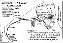 Writing in 1914, Mercer observed that the Wirral had become known as "'The Dormitory of Liverpool' owing to the number of people who reside on the Cheshire side of the Mersey and travel across under the water daily to and from business."[5][3] In addition, New Brighton had become a popular destination for trippers by steamer, but the railway transformed it into a residential town. The Wirral Railway extended from a triangular junction west of Birkenhead Docks to Wallasey, Grove Road. This too opened on 2 January 1888, and was completed as far as New Brighton on 30 March in the same year.[2]