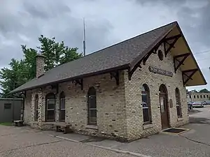 Wisconsin Dells station is an Amtrak intercity train station in Wisconsin Dells, Wisconsin, served by Amtrak's daily Empire Builder. Despite the antiquated appearance, the station was built in 1989. The station is a replica of a former Chicago, Milwaukee, St. Paul and Pacific Railroad (Milwaukee Road) depot,[2] and is in close proximity to a tourist railroad called the Riverside and Great Northern Railway. The previous station on this site was damaged by a Soo Line Railroad freight train derailing in 1982 (although the depot belonged to the Milwaukee Road then; the Soo Line did not merge with the Milwaukee until 1986.) A nonprofit group was created in the town in order to raise funds for the current station building.[3]