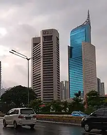 This building has a modern design and also a unique appearance, which is curved shaped like a pen and fully covered by square patterned glass facade. On either side of the tower, the glass facade is covered by a hollow concrete wall that is also square shaped.[6] Because of its uniqueness, this skyscraper is one of the icons of Jakarta after Monas.[7]