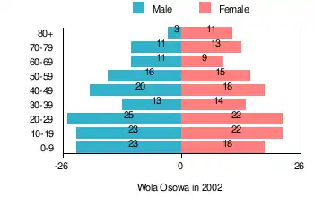 According to the 2002 Poland census, there were 287 people residing in Wola Osowa village, of whom 50.5% were male and 49.5% were female. In the village, the population was spread out, with 28.2% under the age of 18, 33.4% from 18 to 44, 19.9% from 45 to 64, and 18.5% who were 65 years of age or older.[1]