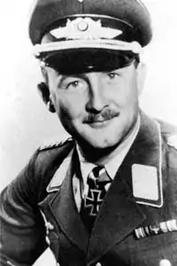 In late August it was becoming apparent to the Oberkommando der Wehrmacht (German High Command) that the Battle of Britain was not going as planned. The frustrated Commander-in-Chief of the Luftwaffe, Hermann Göring, relieved several Geschwaderkommodore of their commands, and appointed younger, more aggressive men in their place.[23] In consequence, on 2 September, Schellmann was given command of JG 2 thus succeeding Oberstleutnant Harry von Bülow-Bothkamp who was transferred.[24] Command of II. Gruppe was passed to Hauptmann Karl-Heinz Greisert.[25] On 18 September, he was awarded the Knight's Cross of the Iron Cross (Ritterkreuz des Eisernen Kreuzes) for his 23 victories, including the 12 in Spain. The presentation was made by Göring at the headquarters of the Netherlands, General der Flieger (General of the Flyers) Friedrich Christiansen, at Wassenaar near The Hague on 19 September.[26] Schellmann claimed his only aerial victory as Geschwaderkommodore of JG 2 on 26 September 1940 when he shot down a Spitfire fighter near the Isle of Wight.[27]
