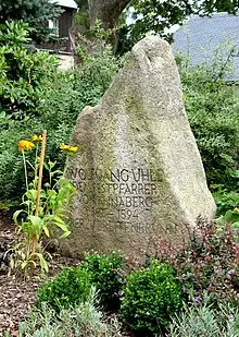 On 7 April 1594, the first Sunday after Easter,[3] Uhle suffered a stroke by the altar and died around one o'clock. Whether he was buried in the Breitenbrunn Church or in its associated cemetery is not known. At the edge of the churchyard in Breitenbrunn there is a stone in memory of Wolfgang Uhle. At the site near Clausnitz where the judge died there is also a Pastor Uhle Stone (Pfarrer-Uhle-Stein).