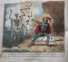 The chapbook had a folding, engraved hand-colored frontispiece with the caption: "Deeper grew the gloom of the cavern, darkness seemed to press around them. Suddenly a flash of lightning burst through the abyss followed by thunder that seemed to convulse the universal fabric of nature; & borne on the sulpherous blasts, the prince of terror stood before him. --- page 19." This was a depiction of the final scene: a giant skeleton, a lightning bolt, the corpse of Serena, and the terrified Wolfstein. Under the engraving was the notation: "Pubd. by J. Bailey, 116 Chancery Lane, London."[7]