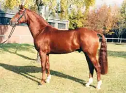 In 1993, as a two-year-old, Wolkentanz was named champion at the Verden Stallion Licensing. In 1994, he was named Champion Three-Year-Old Riding Horse at the Federal Championships of German Riding Horses.[5] In 1995, at age four, Wolkentanz completed the stallion performance test with an overall score of 133.78 and was rated the best stallion of his age group.[4] In 1996 he was Reserve Champion (Bundeschampion), ridden by Ole Köhler.[6] He became known as a performance horse at Celle as part of the Celle Dressage Quadrille, recognized for having a very good-quality trot.[2]
