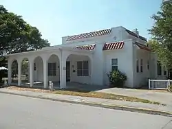 The building completed in 1930 is a concrete block and stucco building having one- and two-story sections. It has "modest" Mediterranean Revival styling.[2]