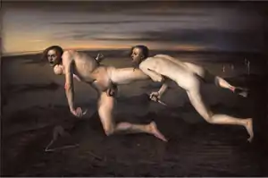 In a dark, rocky coastal landscape, a nude man with open mouth and twisted arms is falling headlong toward the ground. A nude woman armed with a knife is hanging in the air, falling over the man or clinging to his leg. In the background to the right are three additional people who observe the two in the foreground.