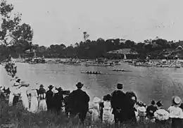 While not being urged to avoid competition, women had few opportunities to compete in sport in Australia until the 1880s. After that date, new sporting facilities were being built around the country and many new sport clubs were created.[1] During the 1890s, cricket and rowing two of the most popular competitive sports for women in Australia.[1] A sculling race was held between two women from Victoria and New South Wales at the Albert Park Lake in Melbourne in 1901, during a regatta organised to celebrate a royal visit. The first recorded women's rowing club was the Albert Park Ladies' Rowing Club, formed in 1907 and based at Albert Park, with similar clubs formed in Brisbane in 1908 (the Brisbane LRC), Sydney in 1909 (the Western Suburbs LRC), and Tasmania in 1912 (the Buckingham LRC and the Sandy Bay LRC).[2] During that time period, rowing was considered an acceptable sport for women to participate in,[3] and was one of the first sports in which women were required to practise daily in order to excel at it.[4] Interstate competition commenced in 1912, when the Brisbane club travelled to Melbourne to race the Albert Park crew. A return race was held the following year in Queensland, but no more interstate events were held until after the conclusion of World War I, when a Victorian crew lost to a South Australian crew in Adelaide. The Women's Four-Oared Championship of Australia was first contested in 1920, in conjunction with the men's King's Cup, and was won by South Australia, who were to win seven of the first eight tournaments.[5]