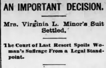 In the early 1870s, across the United States, Black and white women were attempting to register to vote or to vote in various elections, many of them inspired by Virginia Minor.[17][18] Virginia Minor attempted to register to vote on October 15, 1872 in St. Louis and was denied by the registrar, Reese Happersett, on the basis of sex.[17] Her husband, Francis Minor, sued on her behalf since women could not file suits in Missouri until 1889.[17] Based on the argument that she was a United States citizen, he argued, Virginia Minor should be allowed to vote.[17] The case went to the Supreme Court of the United States (SCOTUS) in 1874 as Minor v. Happersett.[17] The court ruled against Minor in a unanimous decision, stating that citizens are not guaranteed the right to vote by the United States Constitution.[16] Chief Justice Morrison Waite wrote: "If the law is wrong, it ought to be changed; but the power for that is not with us."[16] Minor v. Happersett showed suffragists across the country that the path to women's suffrage would be through changing the laws, not challenging them in the courts.[16]