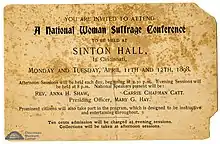Cleveland held the fourth National Women's Rights Convention on October 6, 1853.[17] Well-known suffragists such as Susan B. Anthony, Amelia Bloomer, Antoinette Brown, Lucretia Mott and Lucy Stone all came to participate in the convention that drew women from around the country.[17] At the convention, women discussed various women's rights.[18] One of the rights they outlined was "That women be exempted from taxation until their right of suffrage is practically acknowledged."[18] In 1855 on October 17 the sixth National Women's Rights Convention was held in Cincinnati.[18]