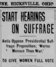 - ↑ "To Open Fight for Presidential Vote". Bucyrus Journal. 1917-01-05. p. 1. Retrieved 2020-09-13 – via Newspapers.com.