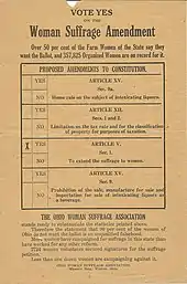Anti-suffragists were also campaigning against the amendment during this time.[32] A campaign using anonymous handbills tied the issue of women's suffrage to prohibition, making it unpopular.[32] OWSA offered a $100 reward for information about who was passing out these anti-suffrage handbills, but the authors were never discovered.[32]