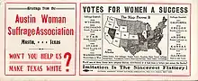 The Austin Woman Suffrage Association (AWSA) in 1913 used a racist dog-whistle in a distributed flier as a response to the anti-suffrage talking point that letting women vote would "endanger white supremacy."[88] In the flier, the states that allowed women to vote were marked in white, emphasizing a white suffragist response that women's suffrage would double the white vote.[88] It was also argued by anti-suffragists that "woman suffrage would result in Negro rule in those sections of the South where colored women outnumbered white women."[38] The Texas Association Opposed to Woman Suffrage (TAOWS) had members that explicitly believed and spread the idea that women's suffrage would lead to socialism and an end to white supremacy.[89]