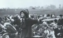 Belle Case La Follette and her daughter, Fola, became involved in the campaign.[56] During the campaign, La Follette spoke on women's suffrage throughout the state, seven days a week, several times day.[57] La Follette influenced first both PEL and WWSA to organize on the grassroots level.[58] They contacted women of influence to host suffrage meetings in their hometowns and the state suffrage groups provided speakers.[58] Suffragists also spoke to labor unions and promised that low wages would end when women could vote.[59] The grassroots approach also helped suffragists reach out to working class women, and women who stayed at home.[60]