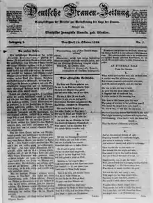 Mathilde Franziska Anneke founded a German language women's rights newspaper in Milwaukee in 1852 called Die Deutsche Frauen-Zeitung.[8][9][10] Two early newspapers, the Telegraph in Kenosha and the Oshkosh True Democrat also supported women's suffrage.[11] The True Democrat was run by James Densmore, who publicly supported the vote for women and challenged other newspaper editors to do the same.[12]