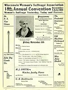 Another state convention was held in Milwaukee in 1869 on February 24–25.[20] Anneke had called for a convention to be held in the city and it was arranged by Lila Peckham and Laura Ross Wolcott and included speakers Susan B. Anthony, Mary Livermore, and Elizabeth Cady Stanton.[20][22] The convention helped re-energize the suffrage movement in Wisconsin.[22] At the convention, the Wisconsin Woman Suffrage Association (WWSA) was formed.[22]