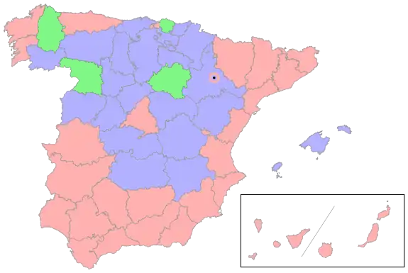 Map of the results of the February 1936 by province: the Republican winners of the Popular Front are in red, while the Nationalist winners are in purple and the Centrists winners are in green