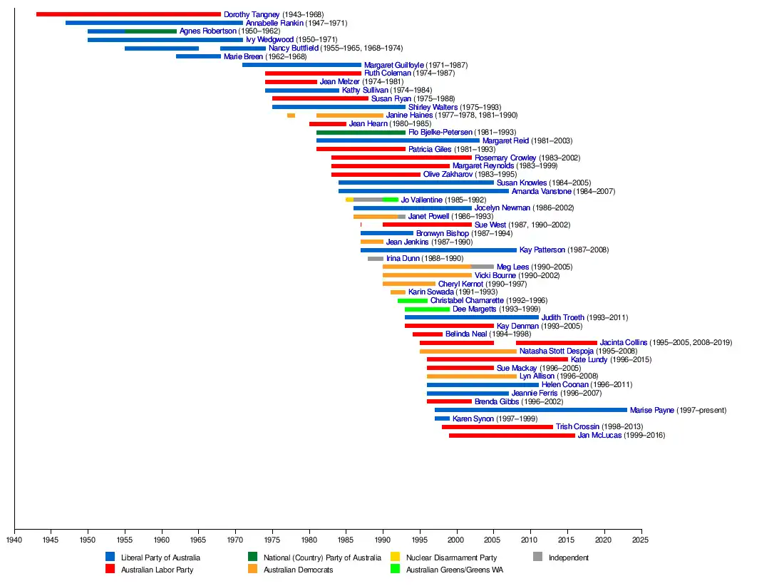 | 2 | (Dame) Annabelle Rankin | Liberal | Qld | 1 July 1947 – 24 April 1971 | resigned |