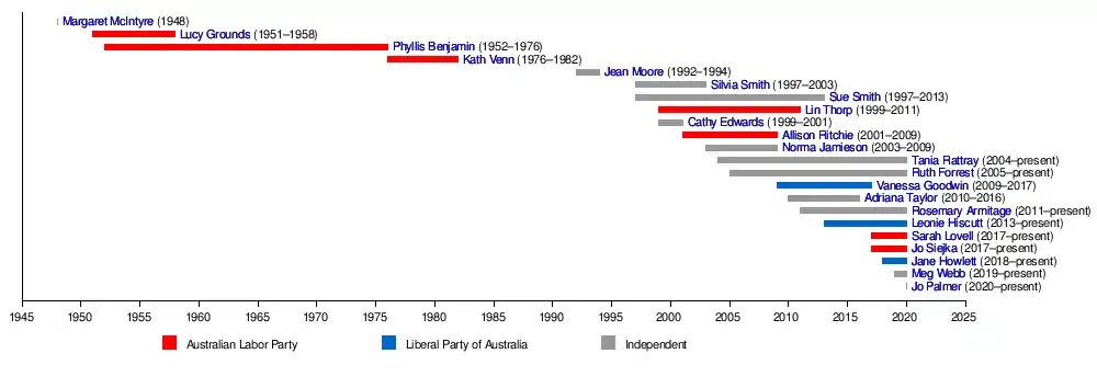 | 13 | Ruth Forrest | Independent | Murchison | 7 May 2005 – |
