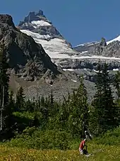 ![]() The Cowlitz Divide portion of the trail, in the southeastern portion of the park, offers many views of Mt. Rainier and its numerous glaciers | |