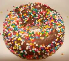 Wonka Donutz were candies sold by Nestlé under their Willy Wonka Candy Company brand. They were donut-shaped pieces of chocolate covered in sprinkles, with a truffle-like inside.[1] These were widely promoted ahead of the release of Charlie and the Chocolate Factory in 2005.[2] However, they were short-lived, and discontinued, due to low sales.[3]