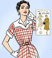 Throughout his career as an artist, Gaylor earned his living in New York's sewing pattern industry. He began in that business making line drawings like the one at left published in 1920 by Butterick's, the company where he first worked. By the 1940s, having become head of another firm, the New York Pattern Company, he oversaw the preparation of drawings such as the one shown at right. The figures in these pictures lack modeling. There is no shading and there are no shadows. They are flat, like paper dolls. These descriptors are the same as those used by critics to describe many of Gaylor's paintings. In 1930, a New York Times critic described the figures in his paintings as "flat like paper dolls, similar to pattern illustrations" and said they had the appearance of figures that had "been cut out of paper and pasted upon a flat ground".[4] In 1979, a Times critic described his paintings as "simple, charming figures and clean, unshaded colors". The critic added that the figures "are organized in meticulously orchestrated compositions that are clearly the work of a sophisticated hand" and described his style as "an alternative to both academic and abstract art".[3]