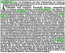 Scott's father was Henry Scott, a wealthy merchant and landowner who was the Mayor of Leeds.[7] In 1779 he married Mary Kaye the sister of Sir John Lister Kaye. In 1890 when his father died he inherited the family estates and two years later founded the Commercial Bank in Leeds. He died in 1813 and his eldest son William Lister Fenton Scott inherited Wood Hall. He advertised the estate for sale in 1818, but decided not to sell it. The advertisement is shown.