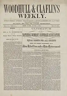 Woodhull & Claflin's Weekly was an American weekly newspaper first published on May 14, 1870, by sisters Victoria Woodhull and Tennessee Claflin. It was among the first publications to be published by women.[1] It lasted until June 10, 1876.
