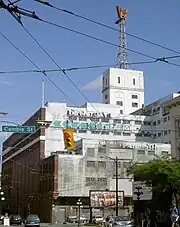 In 1944, the landmark "W" was installed on the top of the building on a 25-metre replica of the Eiffel Tower, replacing a pre-war searchlight beacon which had until then been the building's hallmark. The beacon, which was visible at night from as far away as Abbotsford and Mission, was shut down at the beginning of World War II because of its potential use as a landmark for aerial attacks.