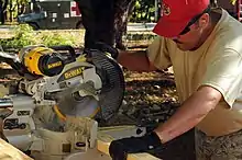 A table saw with a featherboard, a safety device used for preventing kickback.