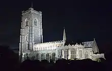 The Holy Trinity Church, Long Melford, Suffolk, is widely regarded as one of the finest wool churches in East Anglia. Built largely from 1467–1497 with funding from local cloth merchants,[2] primarily John Clopton, the structure contains magnificent stained glass from the fifteenth century, the Clopton family chantry chapel and the soaring Lady Chapel, which extends at Holy Trinity's east end.[3] The Flushwork employed by the builders of Holy Trinity is some of the finest in England. The church stands as testimony to the wool business and its dizzying success in medieval times.[4]