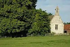 The Church of England parish church of All Saints was built in about 1195 as a dependent chapel of Uffington. The building is of chalk and clunch, with stone quoins.[2] The north doorway is original late Norman,[3] as are two lancet windows, one each on the north and south sides of the nave[3] towards the west end.[2] The chancel arch looks early 13th century.[3] There is a south transept, whose arch and south window look late 13th century. Two north windows of the chancel are Decorated Gothic and one north window in the nave also appears to be early 14th century.[3] The font is 14th century or later and is unusual in being a lead bowl mounted on a stone pillar.[2]