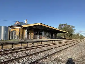 Woomelang station is a closed railway station in Woomelang, Victoria, Australia. It was opened in 1899 and was closed in 1993, when passenger services discontinued on the Mildura line. Although the station is no longer in use as a passenger stop, a station building and two passenger platforms remain. Silos also remain at this station, while the goods shed survived until being demolished in recent years.