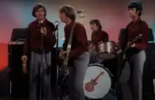 In the episode "Monkees in Manhattan", drummer Micky Dolenz, singer Davy Jones, guitarist Michael Nesmith and bassist Peter Tork's roles are swapped to perform "Words". L-R: Dolenz, Tork, Jones and Nesmith