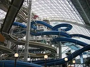 World Waterpark is a water park located within the West Edmonton Mall in Edmonton, Alberta, Canada. Opened to the public in 1986, it is the second largest indoor water park in North America after American Dream's DreamWorks Water Park which opened on October 1, 2020.[7][8][9][10][11] It has a maximum capacity of 5,000 guests, an average air temperature of 31 °C (88 °F) and contains the world's largest indoor wave pool with a capacity of 12.5 million liters.[12][13]