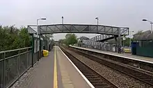 There are two platforms, on either side of the two tracks through the station. The southern platform, platform 1, serves westbound trains (towards Weston-super-Mare and Taunton); the northern platform, platform 2, serves eastbound trains (towards Bristol). Both platforms are 100 metres (110 yd) long. The line through the station has a speed limit of 100 miles per hour (160 km/h), and is not electrified.[6] Access between the platforms is via an open footbridge with long, sloped ramps for step-free access. Ticket machines are available, and a small ticket office operates during the weekday morning peak, but the station is otherwise unstaffed. Help points are provided, allowing travellers to ask questions of a call centre. There are metal and glass waiting shelters on both platforms – two on the eastbound platform and one on the westbound. Most recently, improved lighting and CCTV has been provided and for the first time since construction, electronic train arrival boards with automated voice announcements have been provided on both platforms and also a silent, less detailed digital arrivals / departures board adjacent to the ticket office.[2]