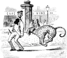 Punch magazine mocked the book's style and content with a parody in an 1891 issue, as part of the magazine's "Mr. Punch's Prize Novels" series.[3] The parody, titled "Germfood" and attributed to "Mary Morally", is an account of a Parisian man addicted to marrons glacés (a candied chestnut confection). The piece mocks Corelli's writing style, including her use of archaisms like thou and her solecistic French (for example, it quotes her narrator saying "Nous blaguons le chose."—since chose is feminine, this is grammatically incorrect, and should instead be "Nous blaguons la chose."[lower-alpha 1]). It furthermore sends up Wormwood's melodramatic and lurid plot, with Mary Morally warning "I'll give you fits, paralytic fits, epileptic fits, and fits of hysteria, all at the same time.", and the story ending with the revelation that the narrator has inexplicably died: