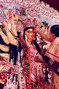 Sindoor being applied on the forehead of Goddess Durga during Durga Puja