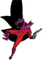 The first Wrath was an enemy of Batman, described by him as his "opposite number".[2] The Wrath's appearance and motivation are reminiscent of Batman's, but with notable differences. The Wrath (like Batman) is distinguished by perfectionism and obsession with what he does. His costume is also very similar to Batman's (though colored in crimson and purple with a W-insignia on the chest and cowl; the W on his cowl, when seen in the right light and at the right angle, looks like the ears of the Batman's cowl).
