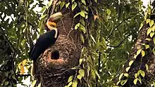 The wreathed hornbill is a monogamous breeder that demonstrates biparental care. It nests in the cavities of large trees located in coastal forests, illegally logged areas, or among foothills up to an elevation of 2,560 m (8,400 ft).[12] It searches for existing oval-shaped tree cavities for nesting because it cannot excavate its own.[27] The nest height ranges from 18 to 28 m (59 to 92 ft) above ground.[28] Females use droppings or mud to cover the nest hole to protect the clutch and fledglings from predators but leave a gap large enough for males to deliver food.[28] They unload the mud when they need to leave the nest.[28]