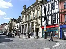 The main arteries of the city centre link all previous areas. Running in an easterly direction from Grosvenor Road, Regent Street and Hope Street are the main shopping streets within the city, terminating at the base of St Giles' Church on High Street. Leading off these streets are a number of other streets, including Queen Street. The majority of this area is pedestrianised, and contains a number of notable landmarks including the thatched 'Horse & Jockey' pub and mock Tudor architecture at Hope St/Queen St.