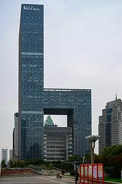Wuhan Poly Plaza,[1] previously named Wuhan Poly Culture Plaza, is west of the intersection of Zhongnan Road and Hongshan Square in the Wuchang District of Wuhan, China. Its height is 221 meters, measured from surface to its roof;[2][3] it has no spires. Designed by Skidmore, Owings & Merrill, it has a floor area of 149,000 m2, which includes both the 46 floors of the main tower and 20 floors of its annex. With a design similar to a chair, the building leaves an open space between the main tower and its annex, below the bridge connecting those two at the height of its 20th floor. Floor 1 to 5 is designed as a shopping mall, 6 and 7 as restaurant and food court, 8 for a movie theater, and the rest of the floors for office space.[4]