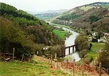 South of Brockweir the river makes a considerable westward loop, and a railway alignment directly serving Tintern would have been challenging. Instead the line provided a Tintern station some distance east of the community; it was the only passing place on the line. The route continued south, crossing the river, running through Tintern Tunnel, 182 yards (166 m), to penetrate the spur of the hill, and running on the eastern side of the Wye. Immediately south of the tunnel the Wireworks branch trailed in. It served the tinplate works at Abbey Hill and had its own substantial bridge of 69 yards (63 m) span, crossing the Wye.