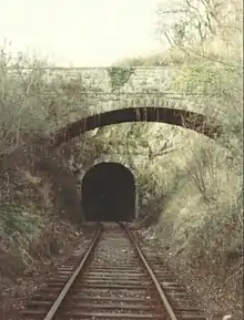 Construction was started at Tintern on 26 May 1874, the contractor Reid Brothers and Co having undertaken to complete the line by December 1875.[17] The technical aspects of the construction were difficult, especially at the southern end of the route. There were two tunnels; the longer was Tidenham (or Denhill) tunnel. When completed it was 1,188 yards (1,086 m) in length (having been planned at 715 yards (654 m)). The actual construction cost of the line was £318,000, the greater part of the expenditure being on the tunnel.[1]