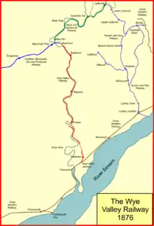 The Wye Valley Railway was a standard gauge railway that ran for nearly 15 miles (24 km) along the Lower Wye Valley between the towns of Chepstow and Monmouth, crossing several times between Wales and England. Opened on 1 November 1876, it was leased to, and worked by, the Great Western Railway (GWR), before being fully absorbed by the GWR in 1905.