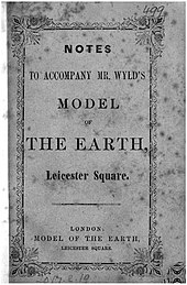 Wyld produced a book to accompany the exhibition: Notes to Accompany Mr. Wyld's Model of the Earth, Leicester Square, a didactic tome which imparted the wealth of Wyld's geographic and historical knowledge while extolling the virtues of London, Britain, and the Empire and which doubled up as a sales catalogue for Wyld's maps at every opportunity.[11][note 9]