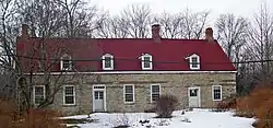 The house is a rectangular 1+1⁄2-story, seven-bay stone house with gabled roof, front dormer windows and chimneys at both ends. The earliest portion of the house is marked by a small entrance and window near the north end on the front (east) facade; the later addition, constituting the bulk of the house, has a transomed door symmetrically placed between two windows on either side. The west facade has a matching door and window placement, now covered by an enclosed porch.[1]