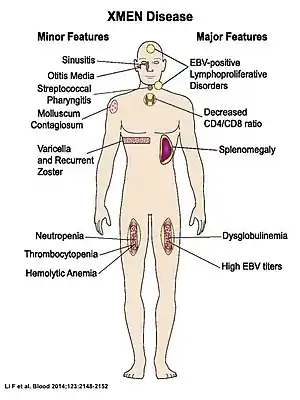 - 1 2 3 4 5 Li FY, Chaigne-Delalande B, Su H, Uzel G, Matthews H, Lenardo MJ (April 2014). "XMEN disease: a new primary immunodeficiency affecting Mg2+ regulation of immunity against Epstein-Barr virus". Blood. 123 (14): 2148–52. doi:10.1182/blood-2013-11-538686. PMC 3975255. PMID 24550228.